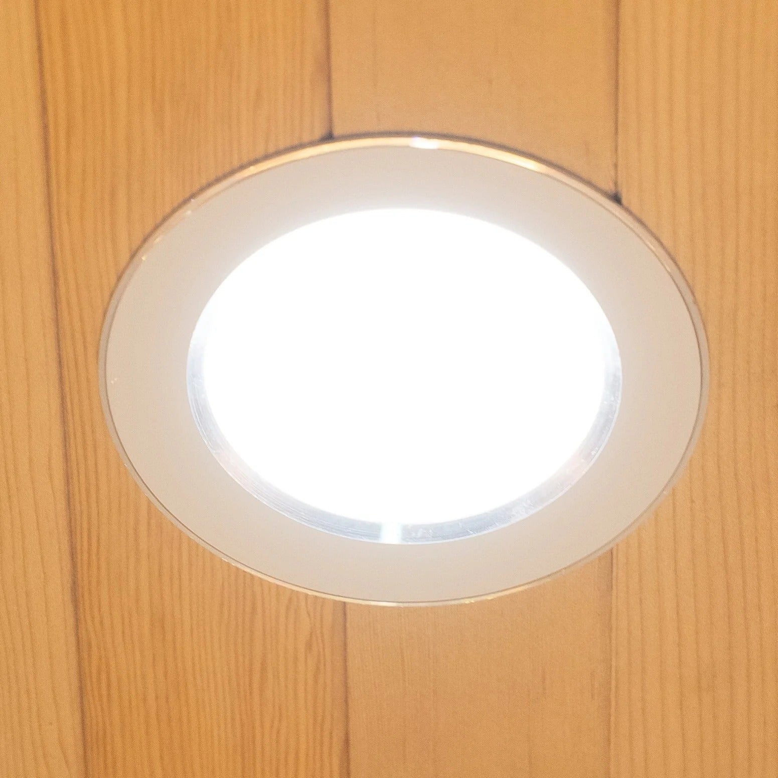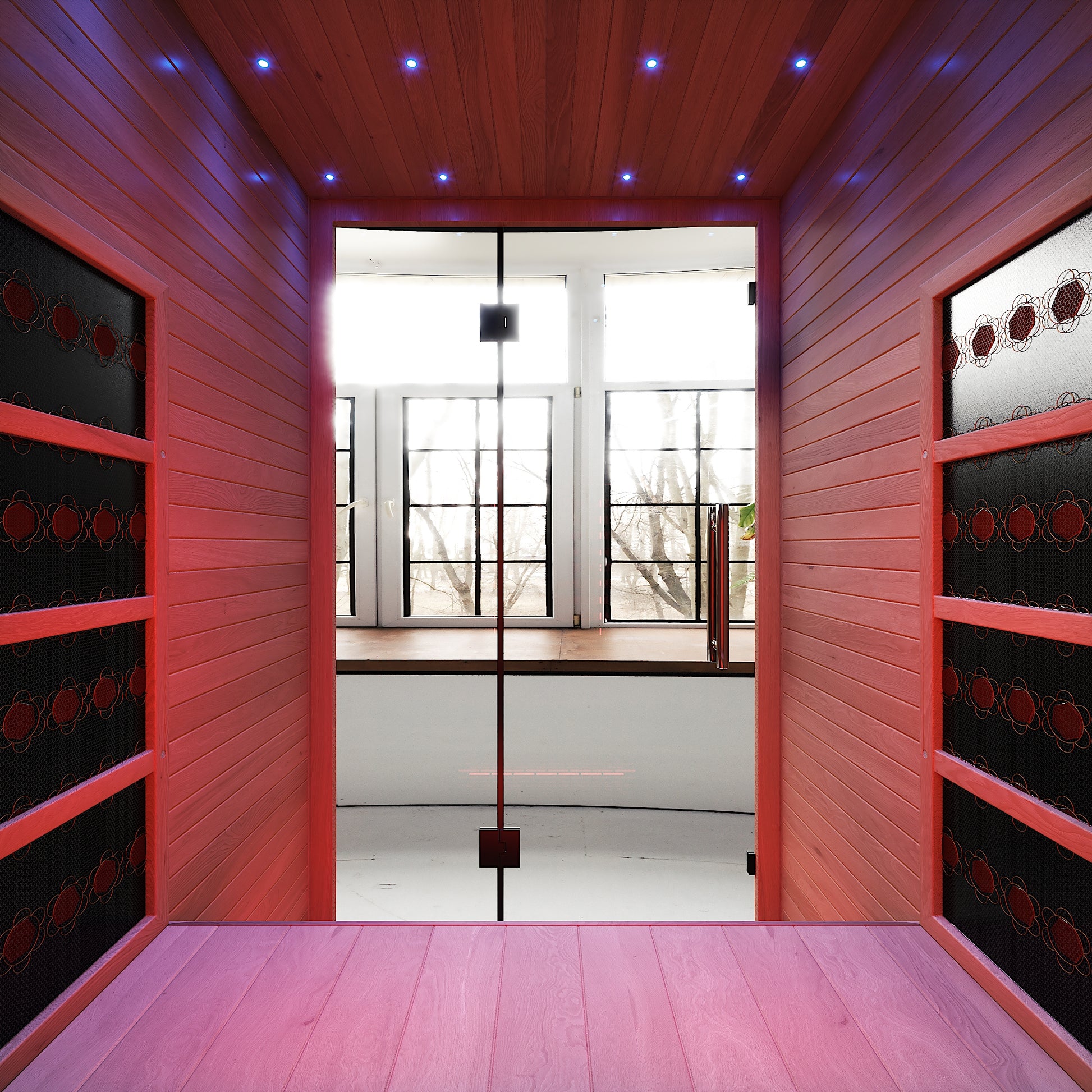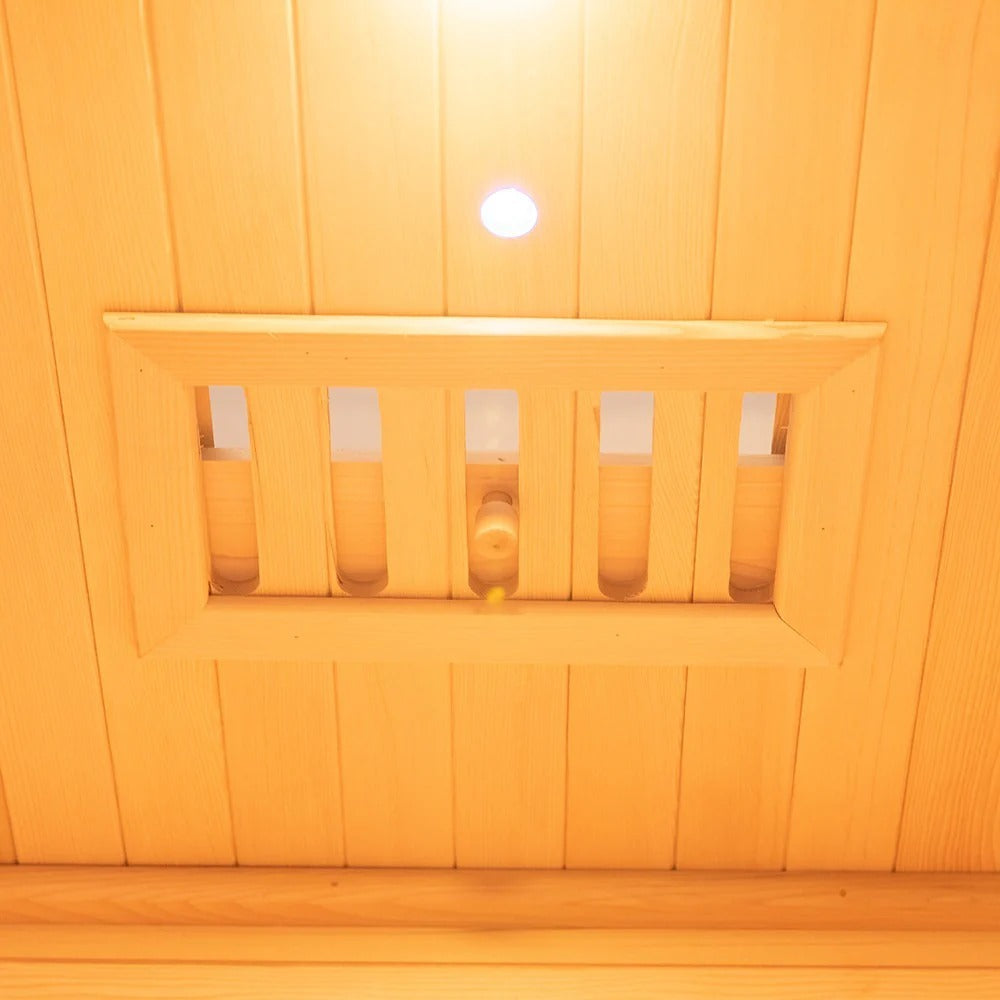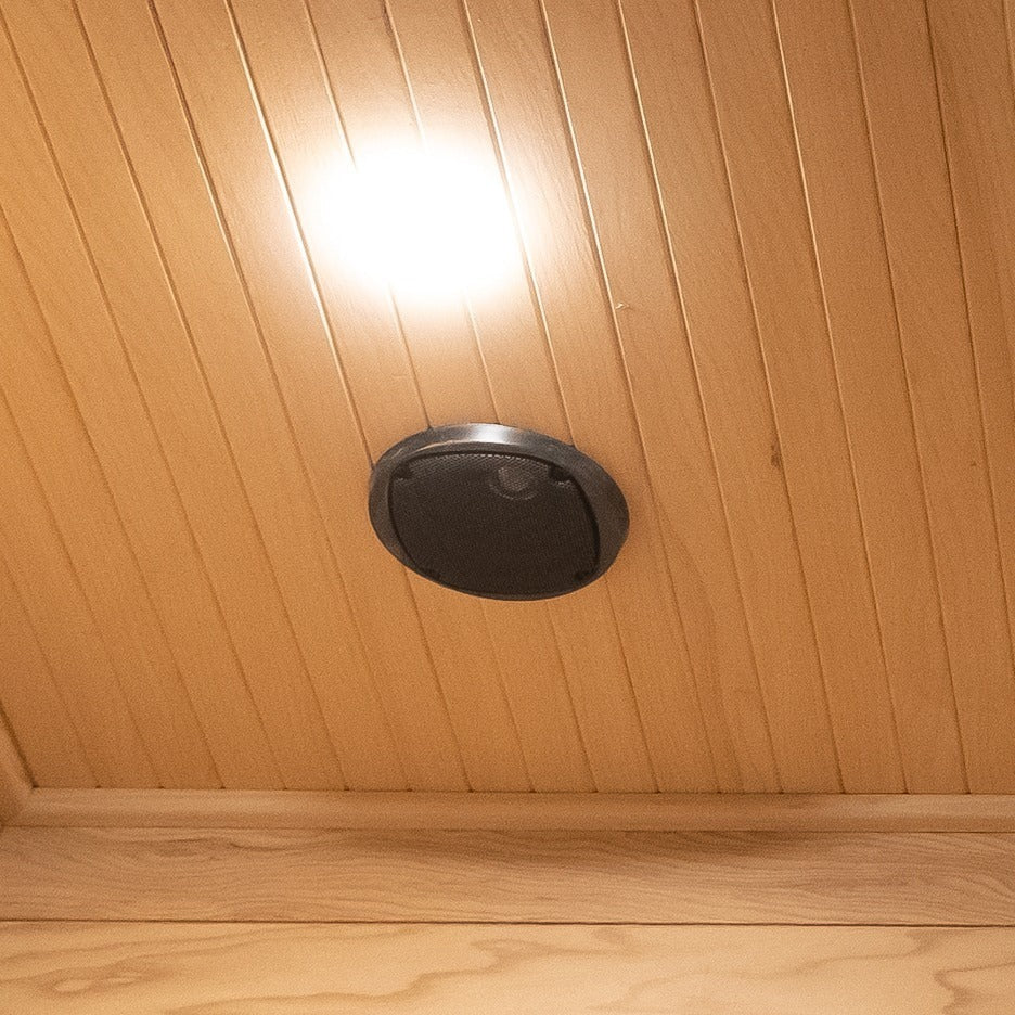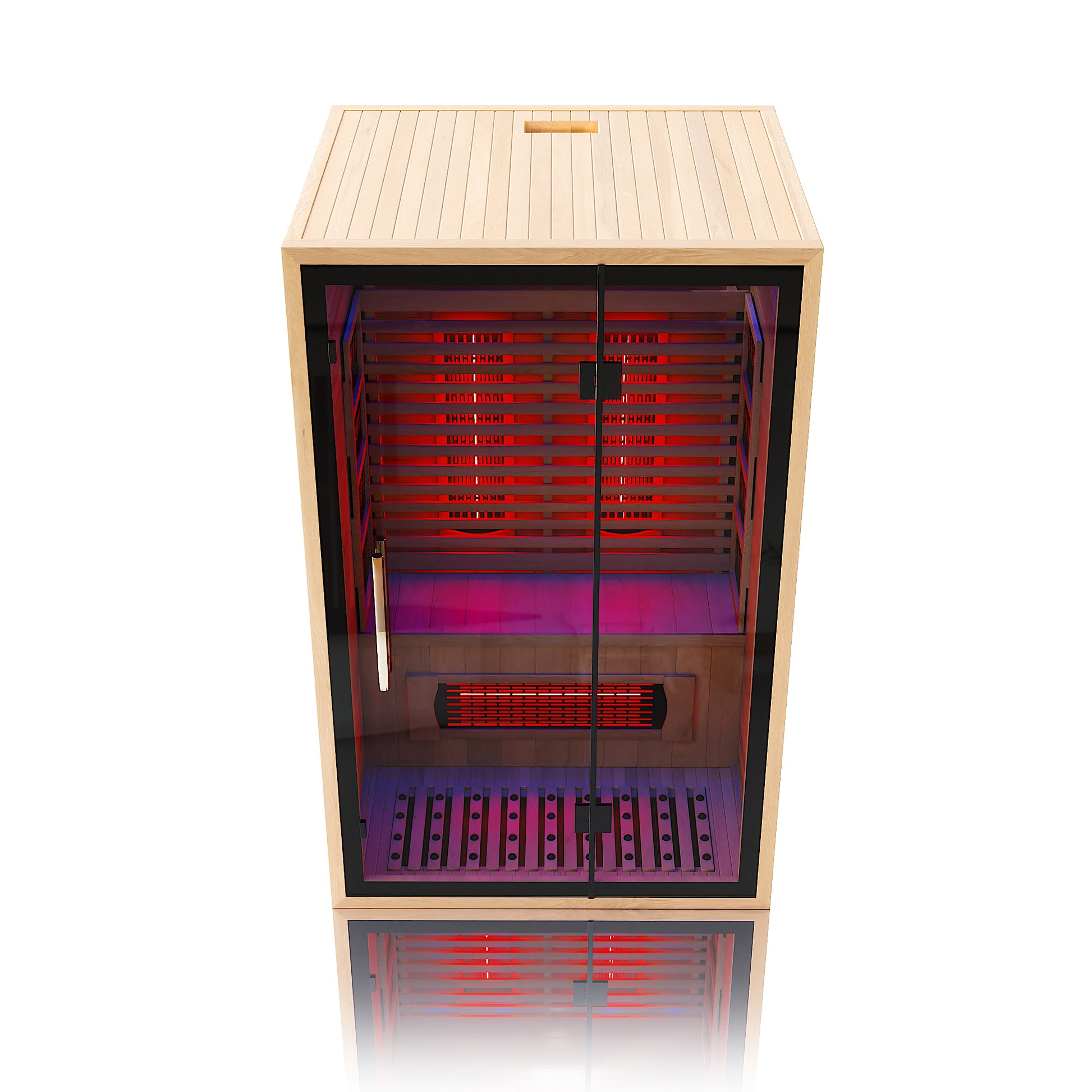 It is crafted from premium Canadian Hemlock, accommodates 1-2 person, features a 1750 W full spectrum + carbon heater (110–120 V, 15 A) with a temperature range of 0–140°F, includes a mobile app control system, remote control, 7-color light therapy lamp, breathable skylight, oxygen bar, temperature sensor, reading light, and Bluetooth speaker, and offers a removable bench and carbon crystal heating plates for efficient, evenly distributed heat, deeper detoxification, improved circulation, skin rejuvenation, and pain relief.