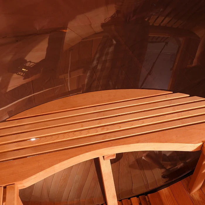 Built-In Flooring & Premium Benches: Includes ergonomic benches with an arched seat design for optimal comfort during sauna sessions.
